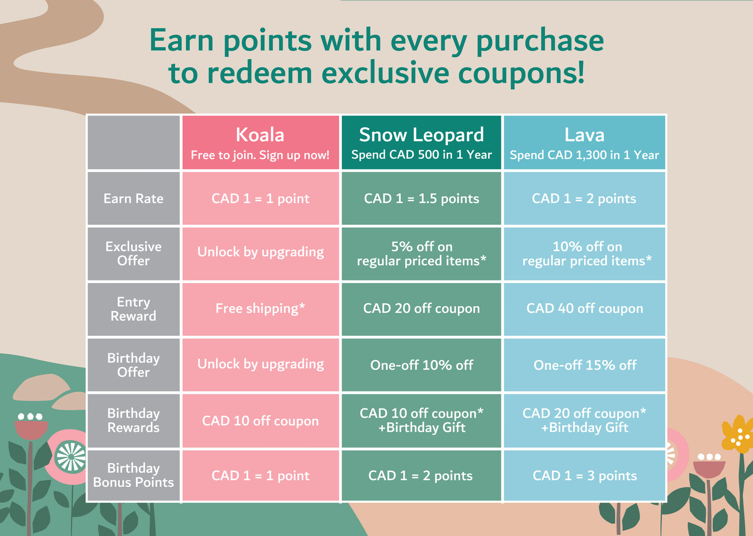 Earn points with every purchase and enjoy exclusive rewards, discounts, and birthday surprises.Spend more within 12 months to unlock higher tiers and even better perks.Points and benefits apply to online purchases only.